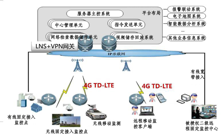 4G移动监控视频监控是指利用4G网络,将摄像机的实时图像回传到监控中心,便于统一监管和调度。主要由后端服务器和装有4G SIM卡的监控前端设备两部分组成。通过安装的前端摄像机采集图像,然后由4G上网卡通过无线,回传到监控服务器或手机终端,由管理人员进行远程监控。主 要功能有实时视频浏览、定时抓拍图片浏览、音视频存储回放、报警联动、系统管理等。