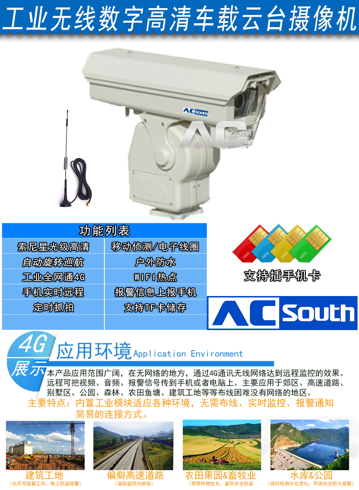 系统结构:工业标准型嵌入式RTOS设计,内置四核64位DSP,IP66级防水,3G/4G工业型高速传输模块,数字高清网络摄像头,工作温度(-30C.+85C.)